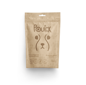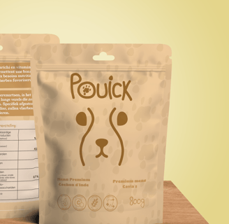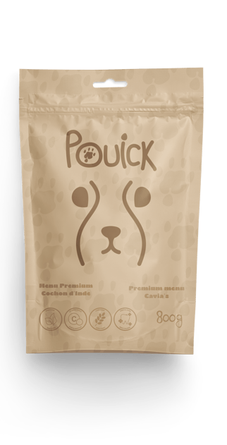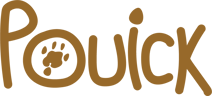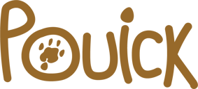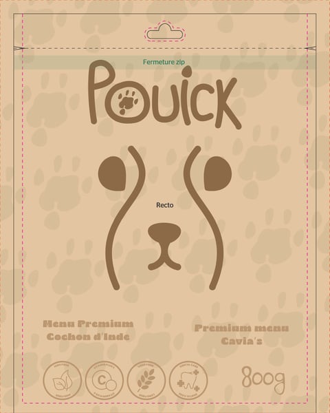 J'ai donc créé Pouick. Le nom fait penser au bruit de l'animal. Au centre du logo du nom, on retrouve une empreinte de patte du cochon d'Inde et la tête en quelques traits simples.